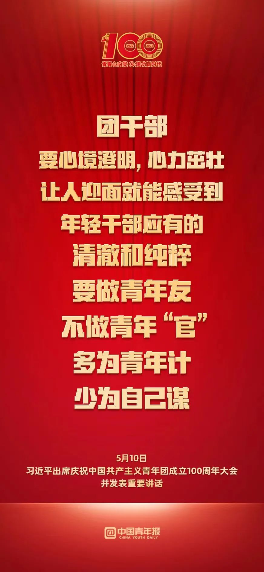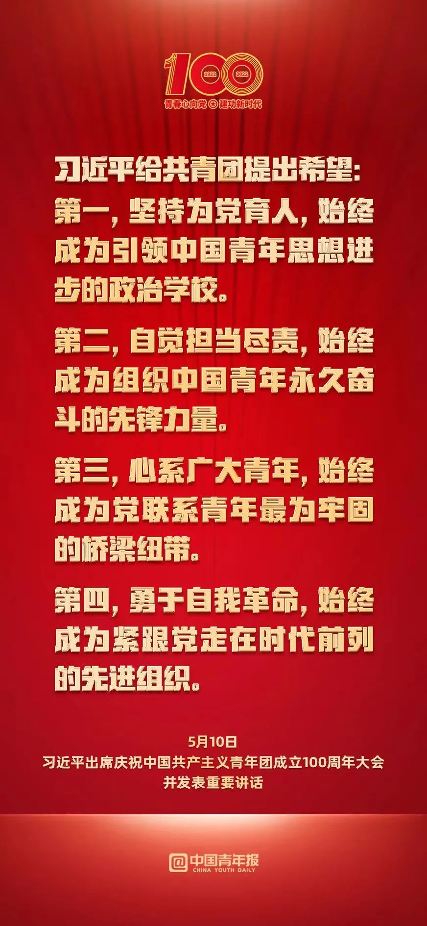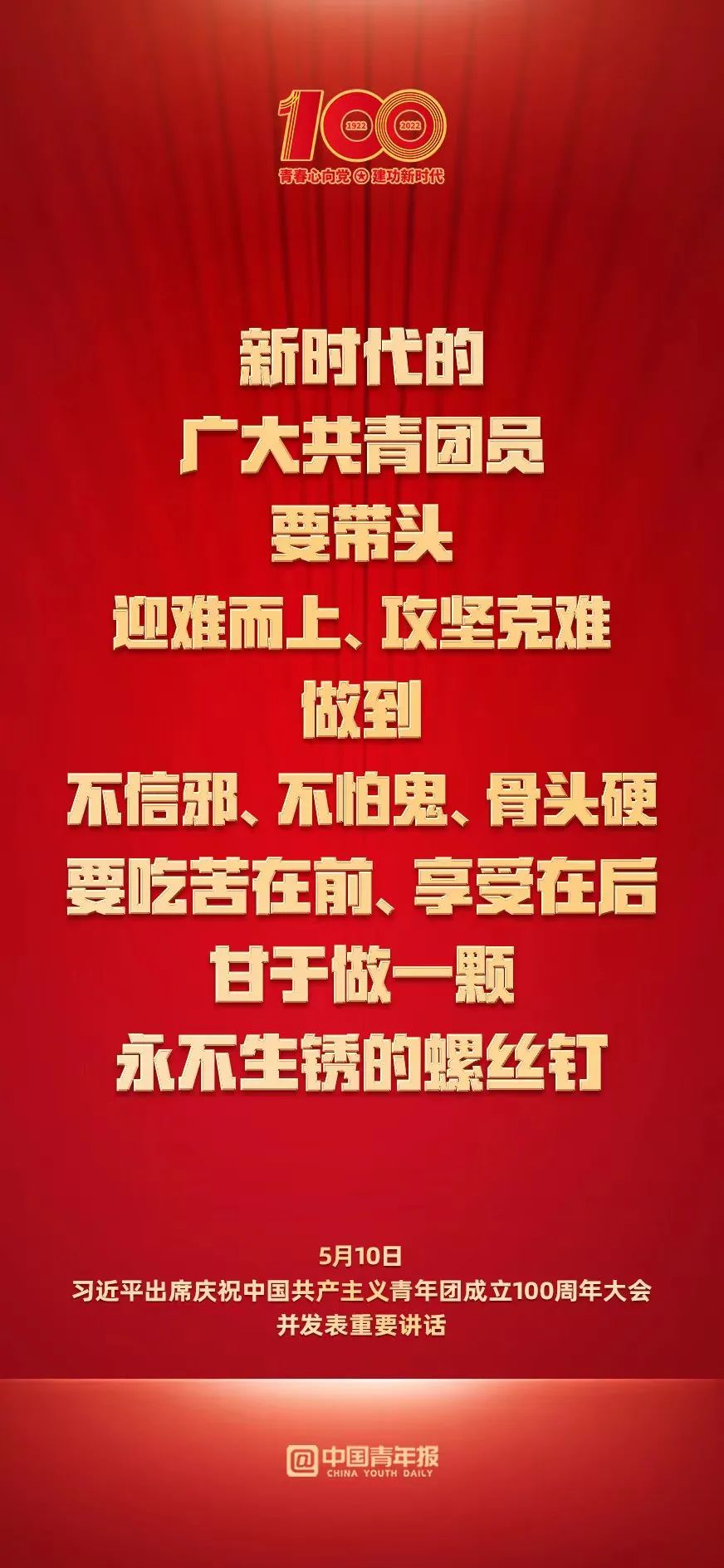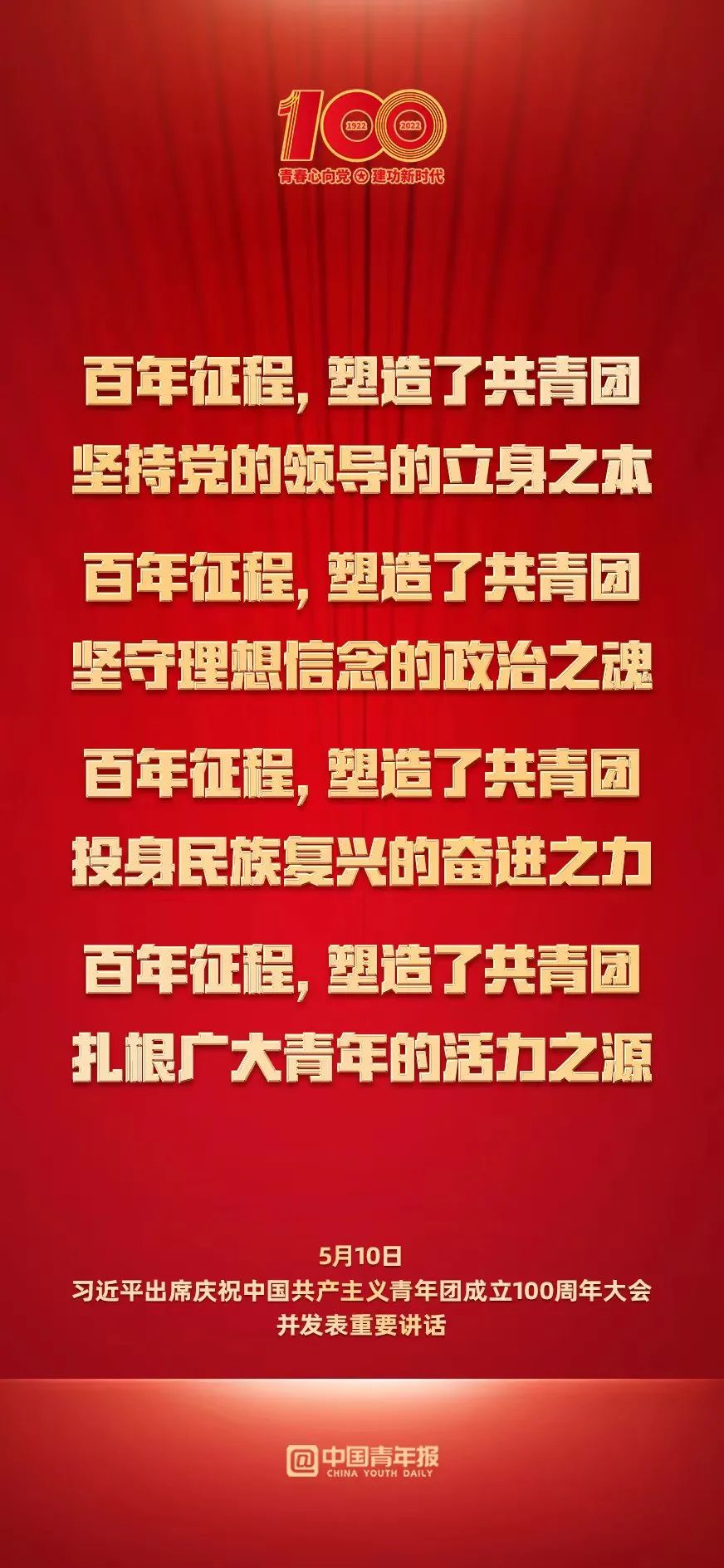 今天,我們?cè)谶@里隆重集會(huì),慶祝中國(guó)共產(chǎn)主義青年團(tuán)成立100周年,就是要激勵(lì)廣大團(tuán)員青年在實(shí)現(xiàn)中華民族偉大復(fù)興中國(guó)夢(mèng)的新征程上奮勇前進(jìn)。