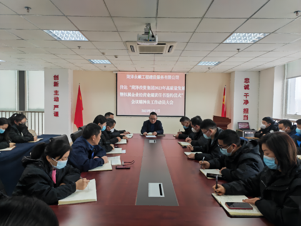 菏澤永順工程建設(shè)服務(wù)有限公司傳達(dá)學(xué)習(xí)“菏澤投資集團(tuán)2023年高質(zhì)量發(fā)展暨權(quán)屬企業(yè)經(jīng)營業(yè)績責(zé)任書簽約儀