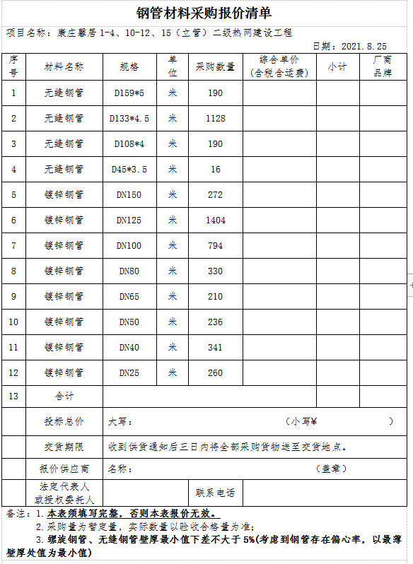 1.材料采購內容:康莊馨居1-4、10-12、15(立管)二級熱網建設工程用鋼管,具體規(guī)格要求、數量詳見材料報價清單。