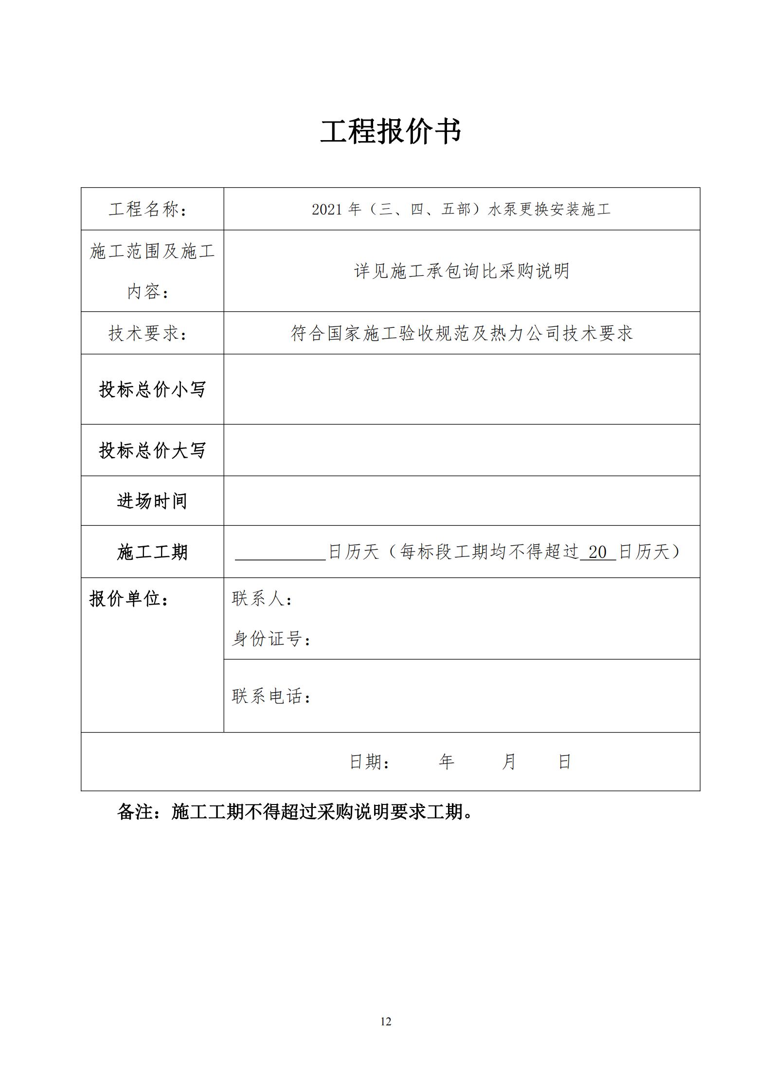 1.供應(yīng)商根據(jù)采購(gòu)人提供的資料及自行勘查現(xiàn)場(chǎng)情況,規(guī)范并完整填寫《2021年(三、四、五部)水泵安裝施工工程量清單》、《工程報(bào)價(jià)書》、《技術(shù)工人清單》,填寫后放入信封中,信封密封并在密封處加蓋公章,在信封上書寫單位名稱。其中:《工程報(bào)價(jià)書》在單位名稱處蓋公章,《2021年(三、四、五部)水泵安裝施工工程量清單》、《技術(shù)工人清單》填寫完整后分別加蓋公章。未按要求提交投標(biāo)資料的取消參加資格。供應(yīng)商參加詢比采購(gòu)會(huì)議時(shí),將2021年(三、四、五部)水泵安裝施工工程量清單、報(bào)價(jià)書、技術(shù)工人清單交與采購(gòu)人現(xiàn)場(chǎng)人員。